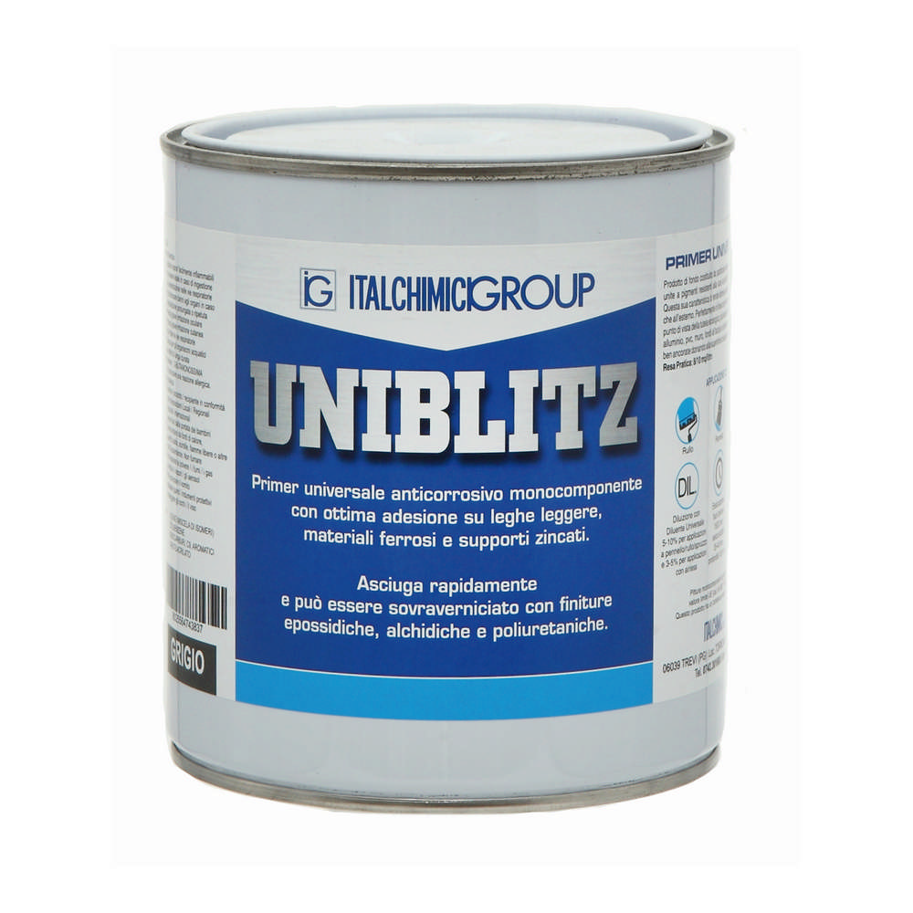 UniBlitz è un primer universale a base epossiestere anticorrosivo monocomponente con ottima adesione su leghe leggere, PVC, vetro materiali ferrosi e supporti zincati. A differenza di alcuni prodotti commercializzati dalla concorrenza, in particolare dai principali colorifici nazionali, con le stesse destinazioni d’uso ma con base sintetica questo prodotto ha i seguenti vantaggi.